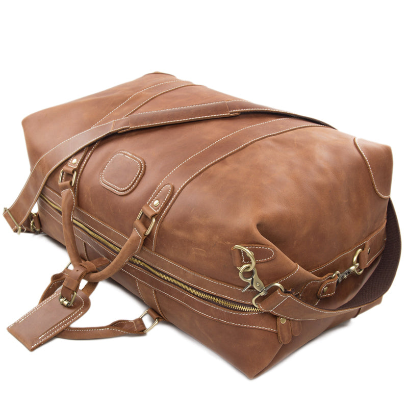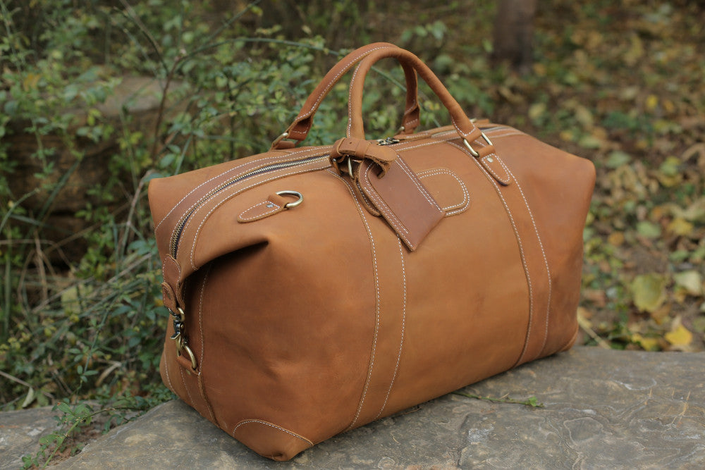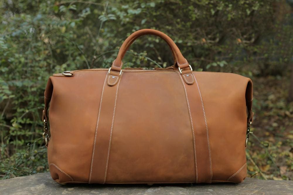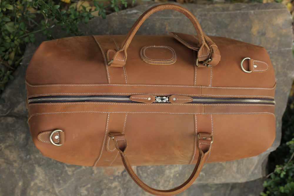 Travel in style with this vintage style genuine leather travel bag that features a large main compartment to hold all of your essentials. It is made from premium cow leather, and features antique brass hardware. With 360 degree spinner wheels and soft leather shoulder straps, this rugged bag is built to handle the rigors of frequent travel.